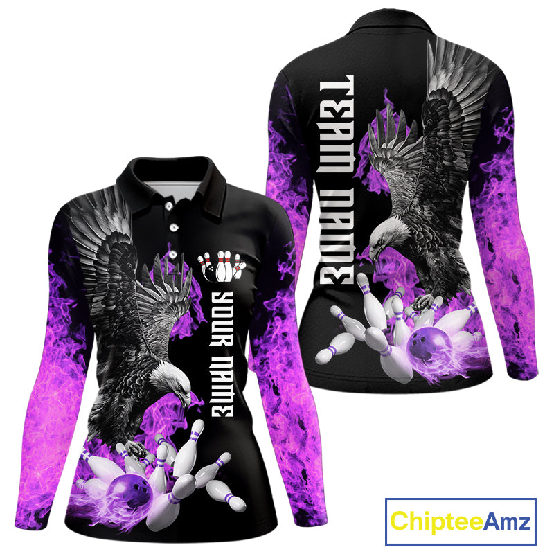 Custom Purple Flame Black Eagle Bowling Polo, Quarter Zip Shirt For Women, Team Bowling Clothes NQS10351