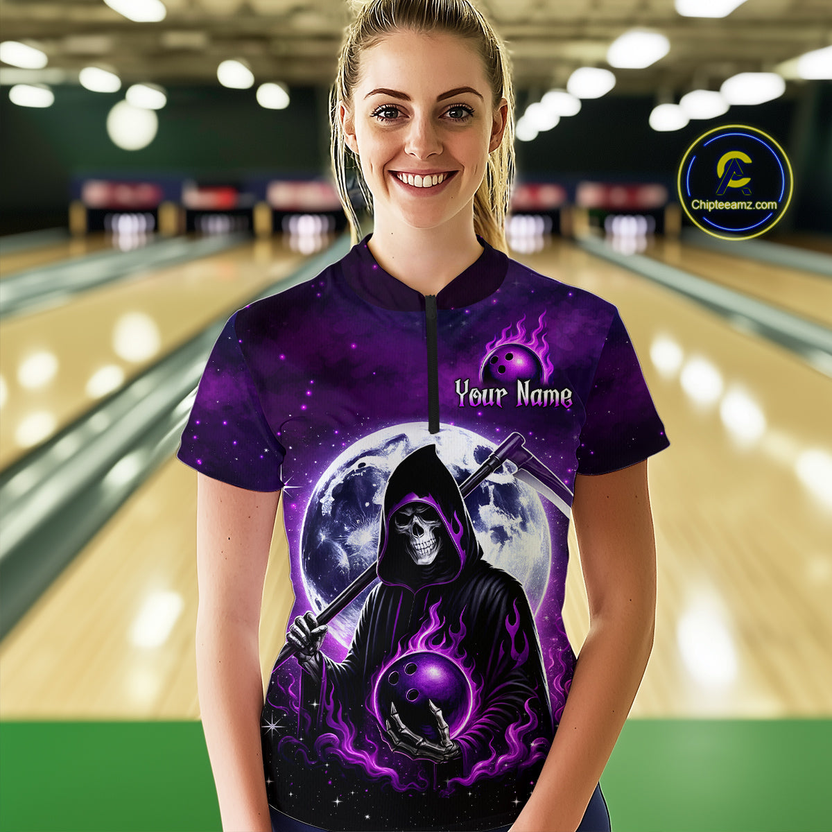 Custom Purple Skeleton Bowling Jersey for Women Bowling Uniform Polo & 1/4 Zip Bowling Team Shirts HNT109