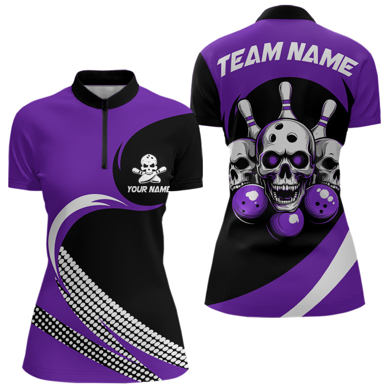 Custom Purple Skull Bowling Shirt Quarter-Zip Bowling Jersey for Men Women Bowling Outfit QZT671