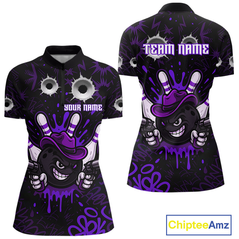 Funny Black & Purple Bowling Cowboy gun Women bowling polo, 1/4 zip shirt Custom bowling team jersey NQS10659