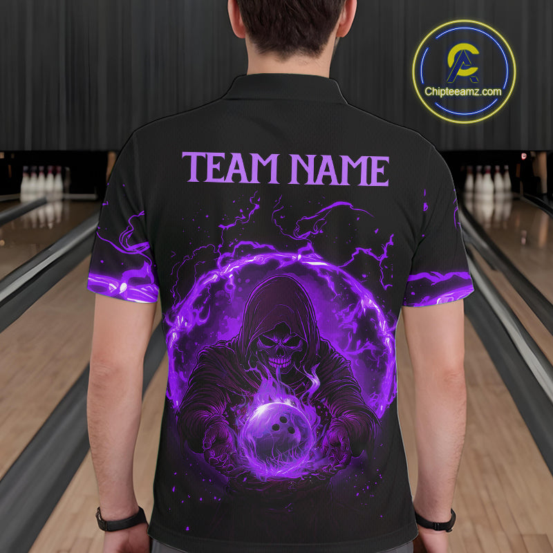 Mens bowling polo, 1/4 zip shirts Custom purple flame skull bowling team jerseys, gift for Bowlers NQS10057