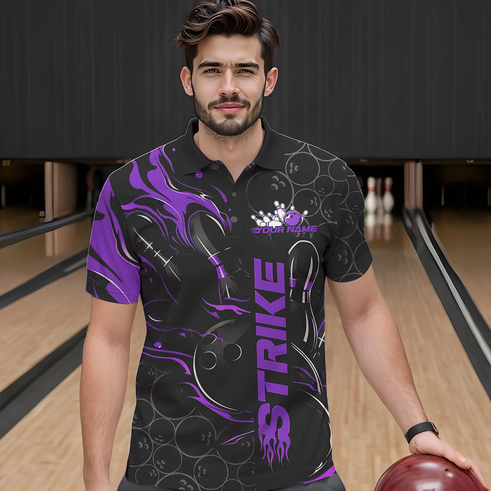Custom Black And Purple Flame Strike Bowling Team Polo Shirts For Men, Strike Bowling Jerseys IPHW8612
