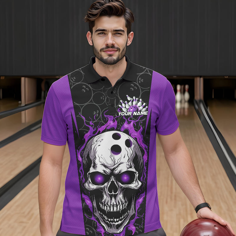 Custom Black And Purple Flame Skull Bowling Polo Shirts For Men, Fire Skull Bowling Outfits IPHW8629
