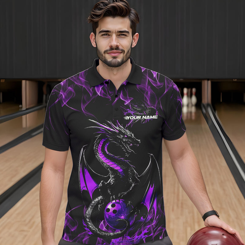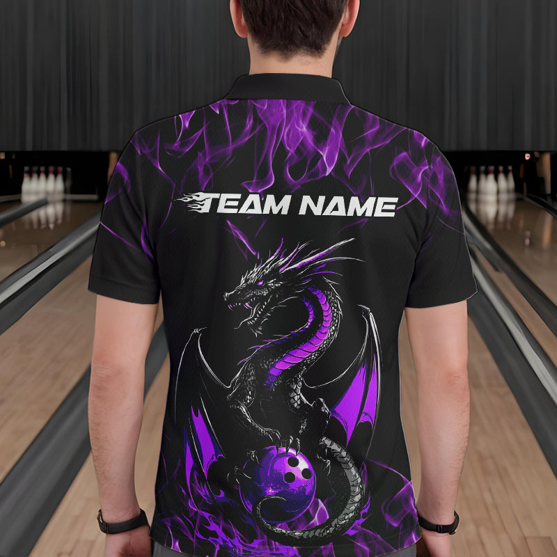 Custom Black And Purple Flame Dragon Bowling Team Polo Shirts For Men, Bowling League Shirt IPHW8654