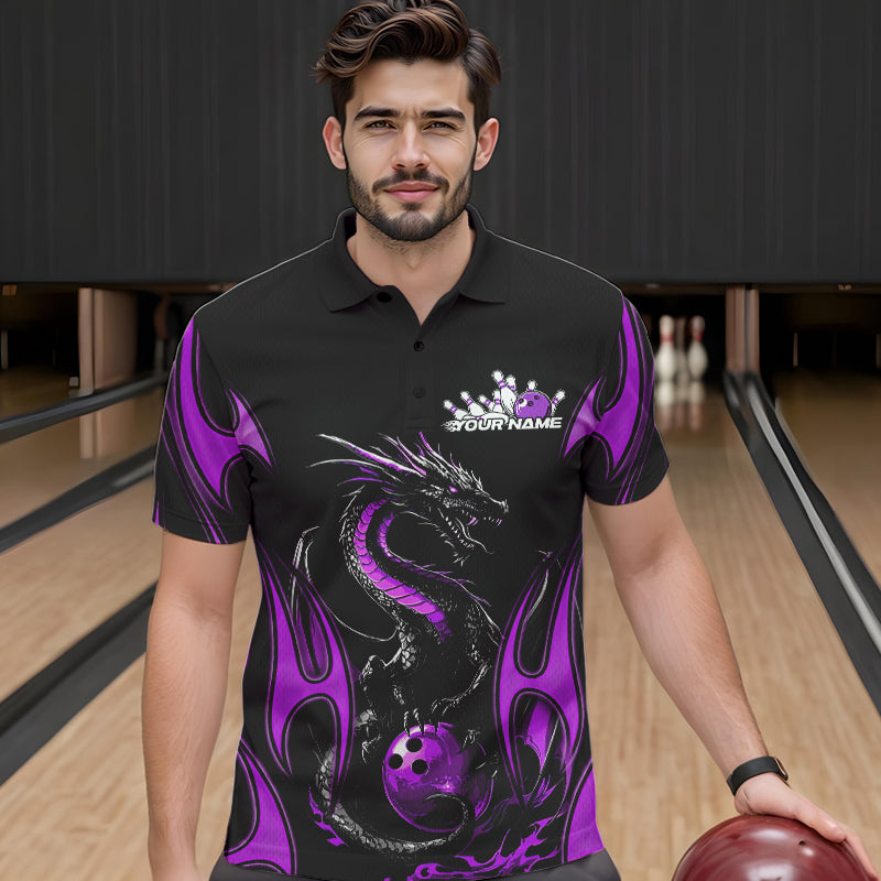 Custom Black And Purple Flame Dragon Bowling Tournament Polo Shirts For Men, Bowlers Outfits IPHW8657