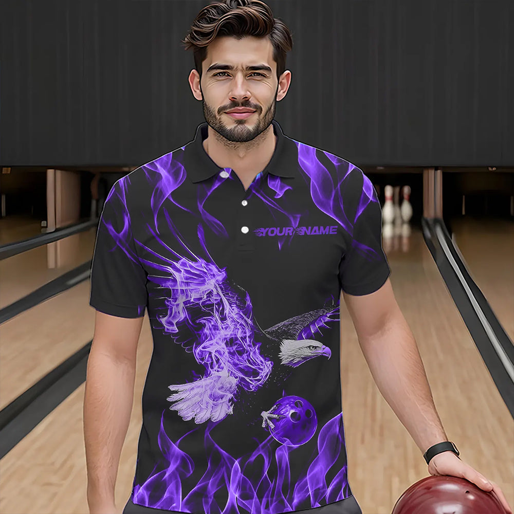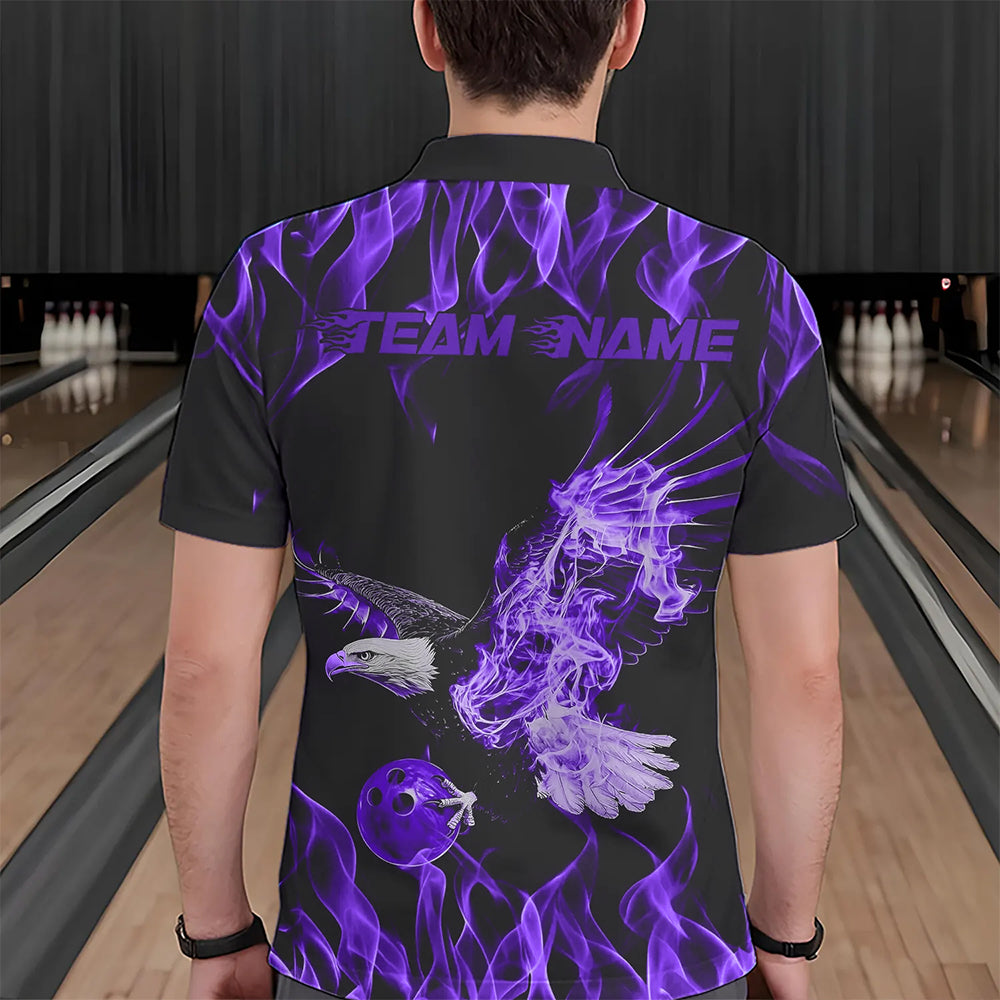 Custom Black And Purple Flame Eagle Bowling Team Men Polo Shirts, Eagle Bowling League Shirt IPHW8790