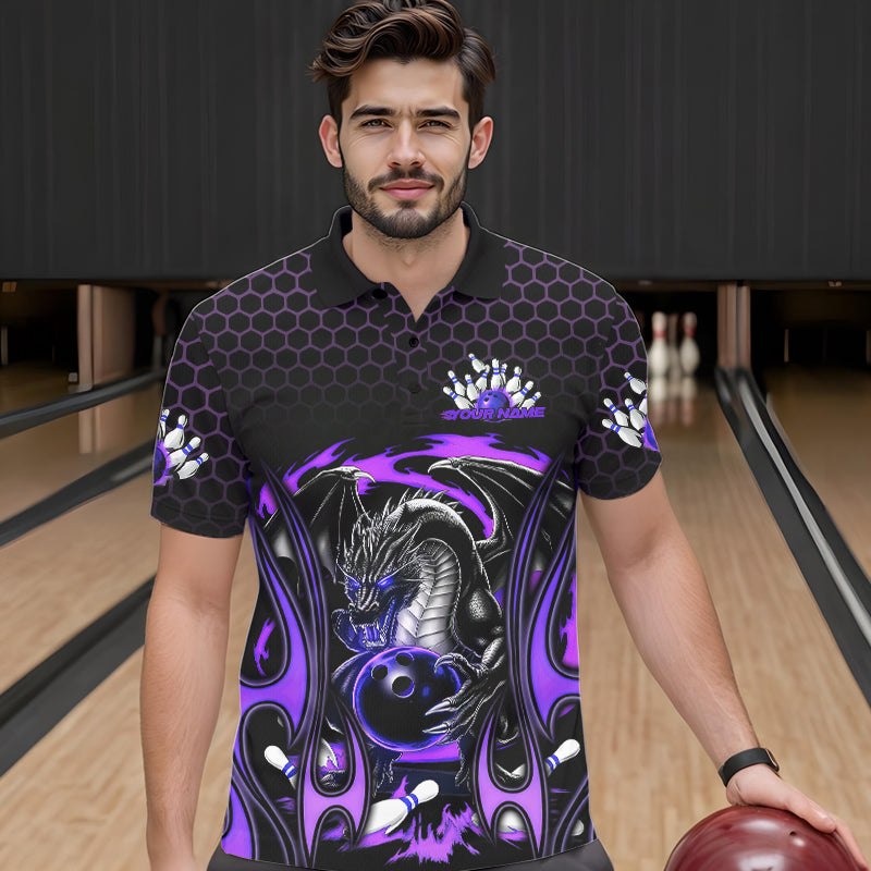 Custom Black And Purple Flame Dragon Bowling Men Polo Shirts, Team Bowling League Shirt IPHW8840