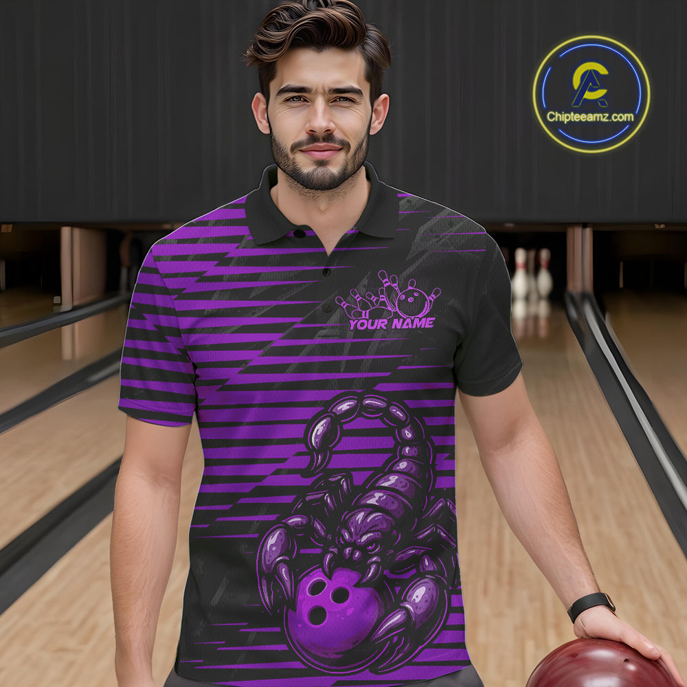 Custom Black And Purple Scorpion Bowling Team Polo Shirts For Men, Bowling League Shirt IPHW9035