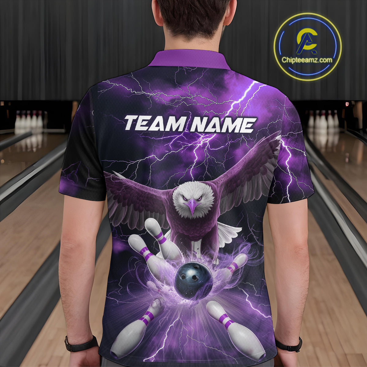 Custom Purple Thunder Lightning Eagle Bowling Polo Shirts For Men, Eagle Bowling Jerseys IPHW9365