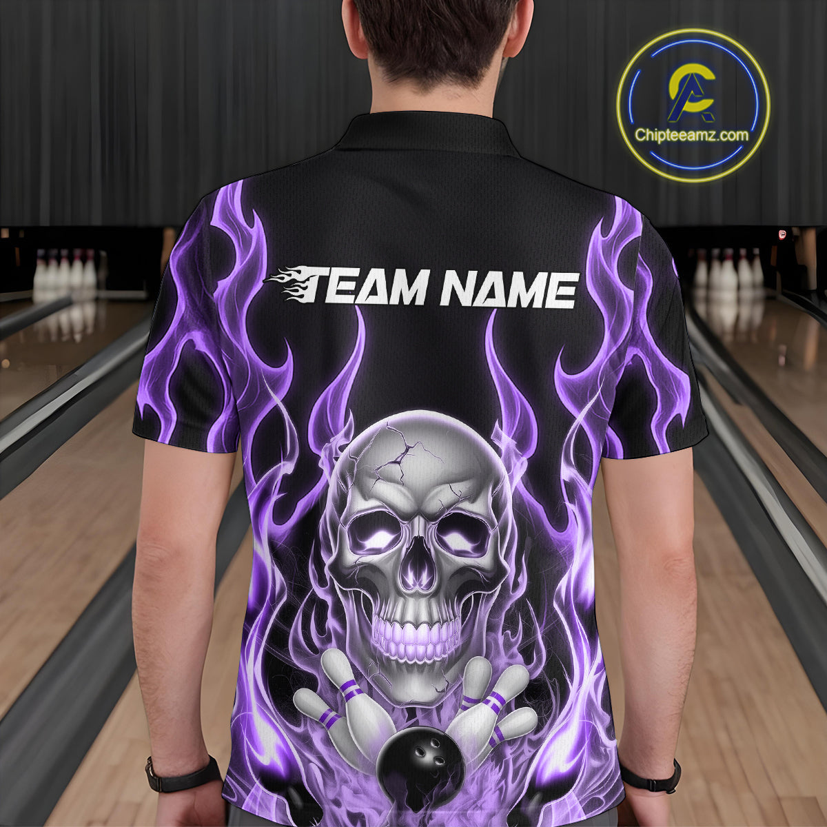 Custom Purple Fire Flame Skull Bowling Polo Shirts For Men, Halloween Bowling Team Outfit IPHW9493