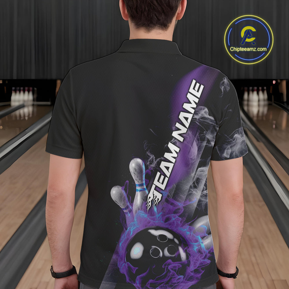 Custom Blue And Purple Flame Strike Bowling Team Polo Shirts For Men, Fire Bowling Jerseys IPHW9572