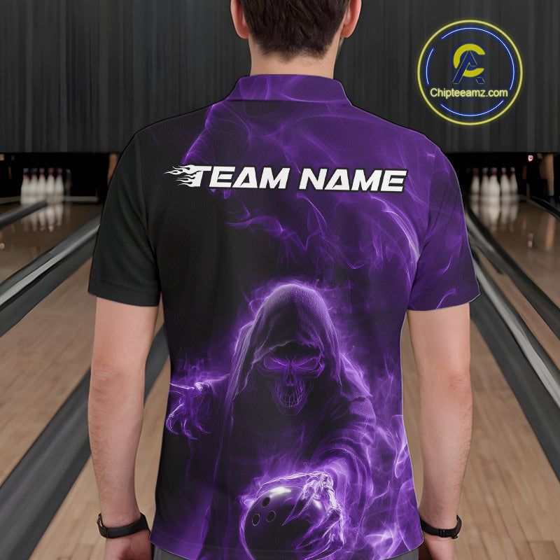 Custom Black And Purple Smoke Flame Grim Reaper Halloween Bowling Men Polo Shirts IPHW9740