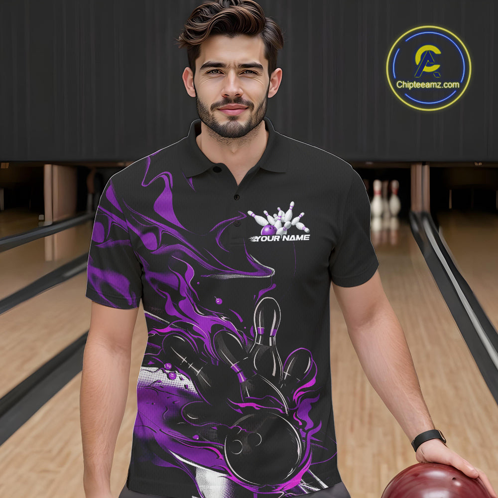 Custom Black And Purple Camo Flame Bowling Team Polo Shirts For Men, Bowling Jerseys IPHW9879