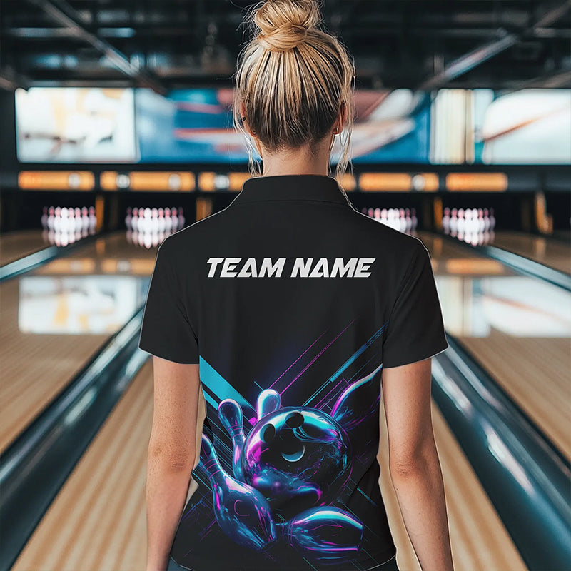 Custom Black, Blue And Purple Holographic Bowling Women Polo Shirts, Bowling Team Uniform IPHW8905
