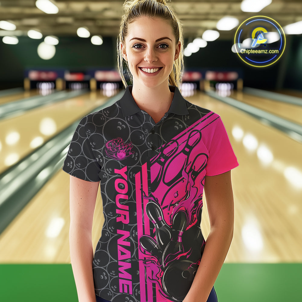 Custom Black And Pink Purple Flame Bowling Polo Shirts For Women, Bowling Pattern Shirt IPHW9272