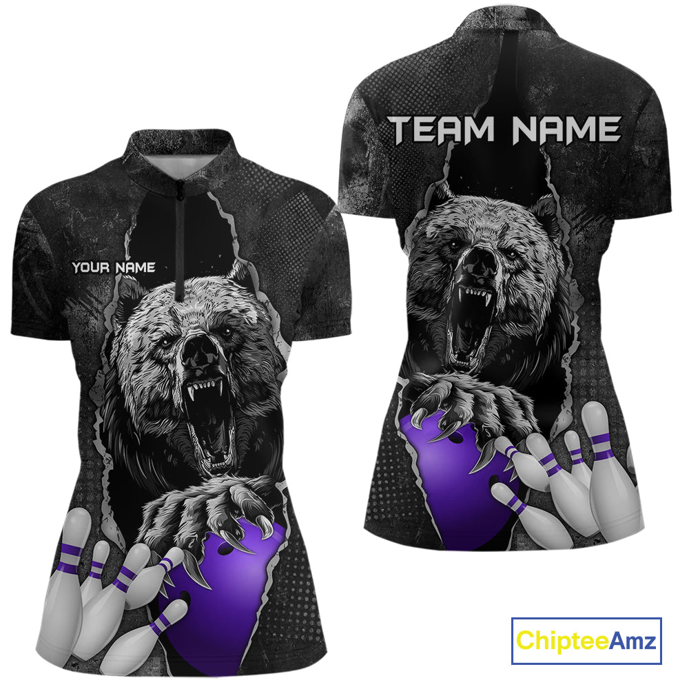 Purple and Black Bear grunge Custom Women Bowling Polo, 1/4 Zip Shirts Bowling Team Jerseys Outfits NQS10167