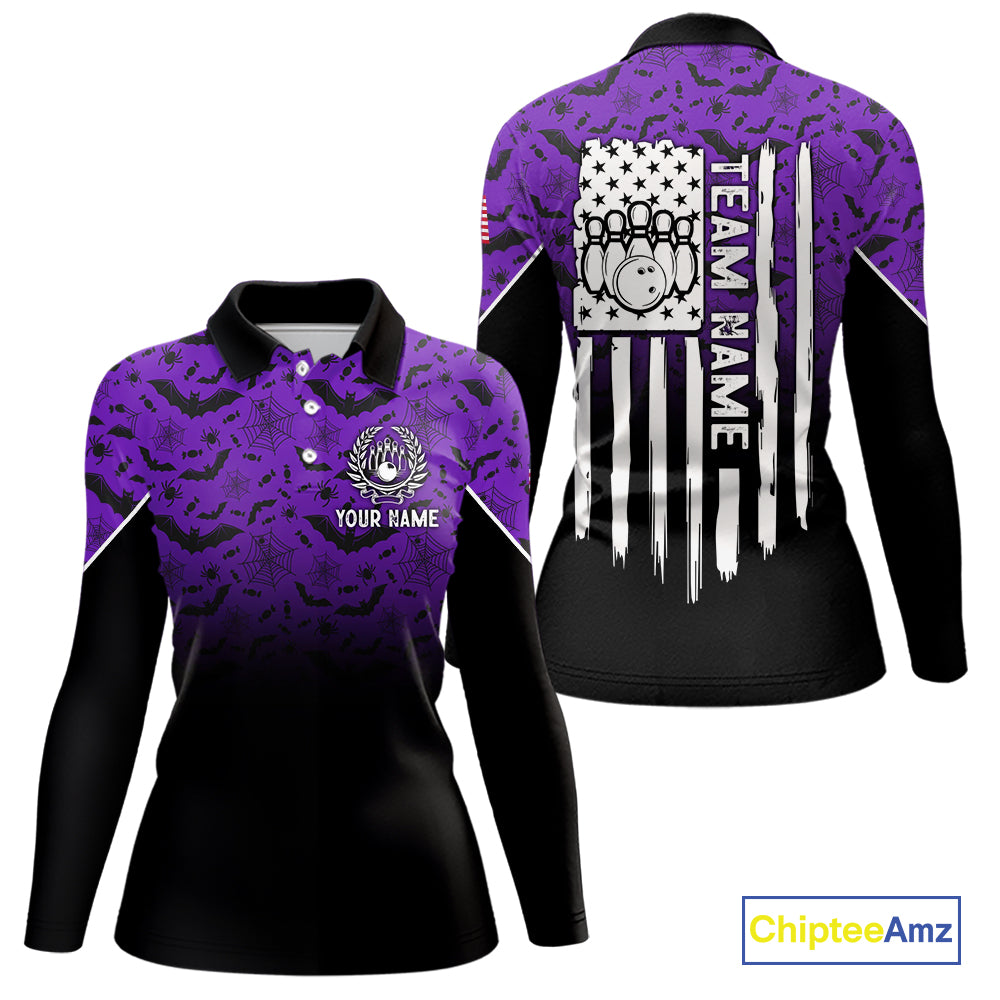Purple Halloween pattern Custom American flag patriotic Bowling shirt for Women, Bowling team jersey NQS10415