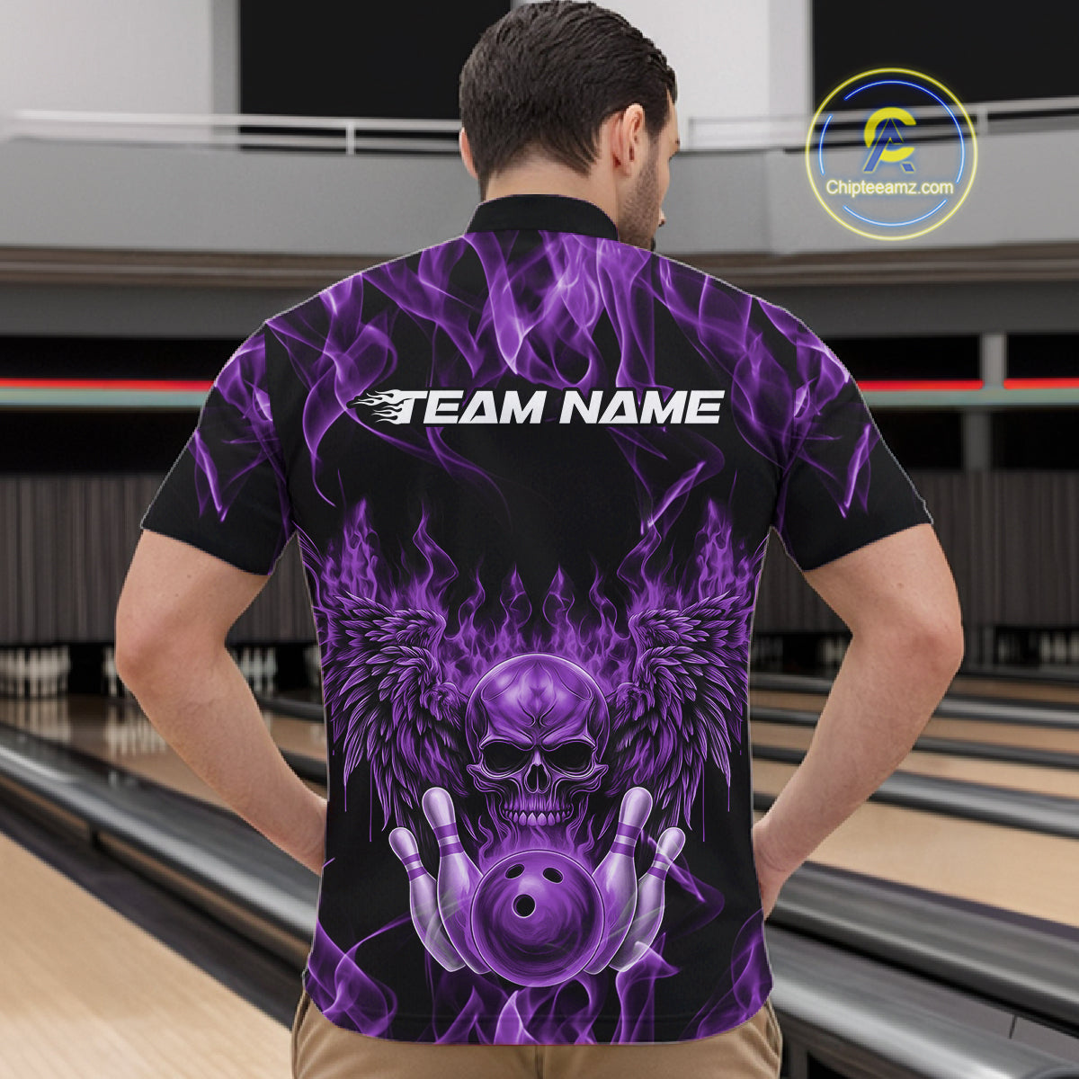 Custom Black And Purple  Flame Skull With Wings Men Bowling Shirt, Halloween Team Shirt IPHW10168