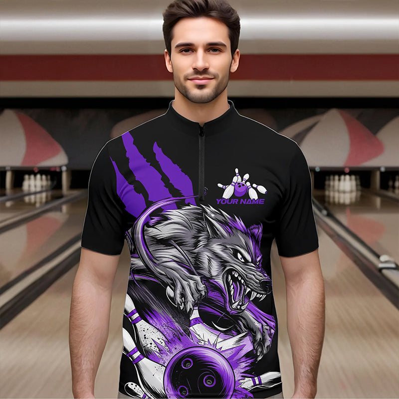 Custom Black And Purple Wolf Bowling Men Quarter-Zip Shirts, Wolf Scratch Bowling Team League Shirt IPHW8721