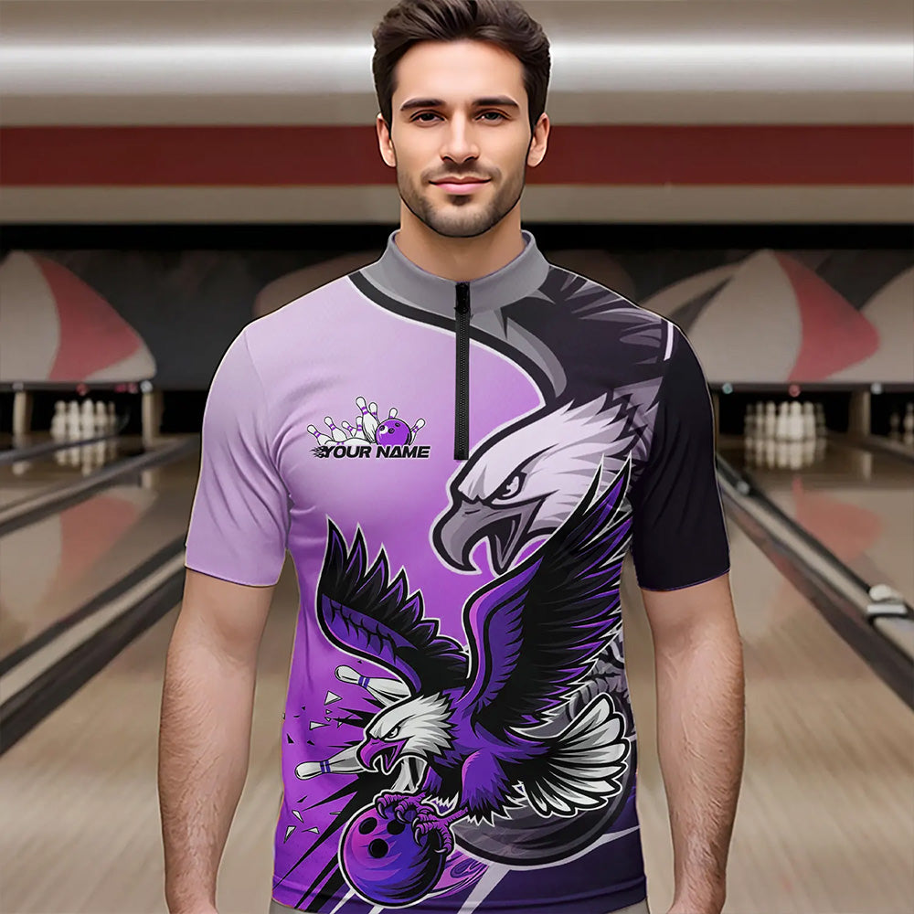 Custom Eagle Bowling Jerseys With Names, Purple Eagle Bowling League Men Quarter-Zip Shirts IPHW8763