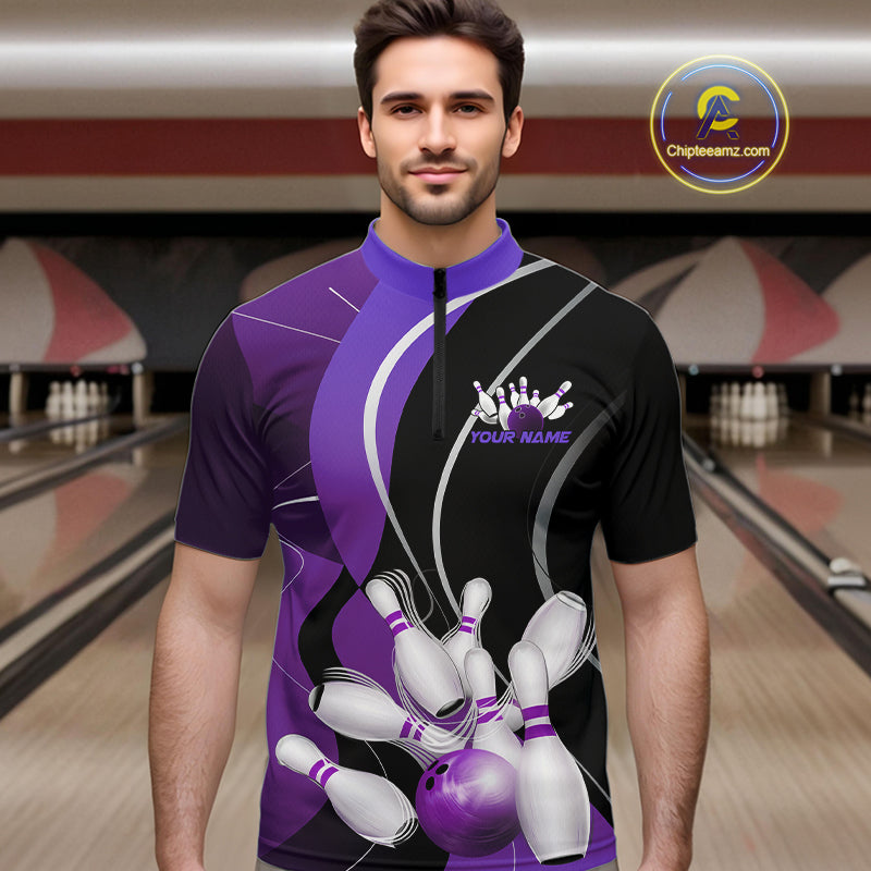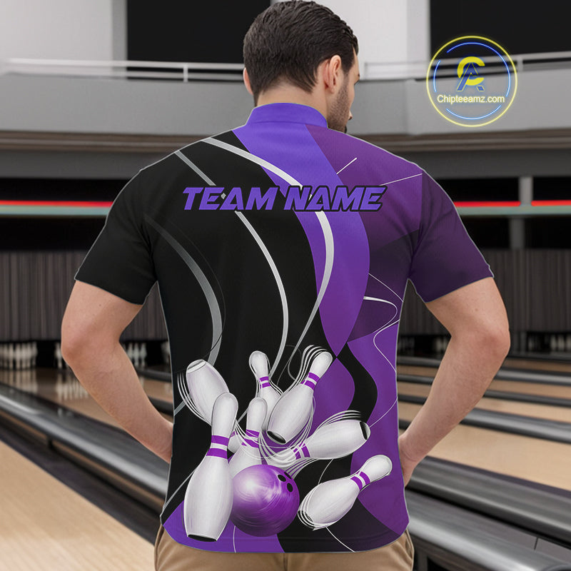 Custom Black And Purple Bowling Jerseys, Men Bowling Quarter-Zip Shirt Team Uniform IPHW9227