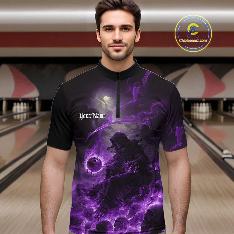 Custom Purple Fire Grim Reaper Bowling Quarter-Zip Shirts For Men, Halloween Bowling Shirt IPHW9466