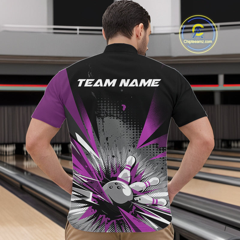 Custom Black And Purple Grunge Bowling Ball And Pins Explosion Team Quarter-Zip Shirts For Men IPHW9549