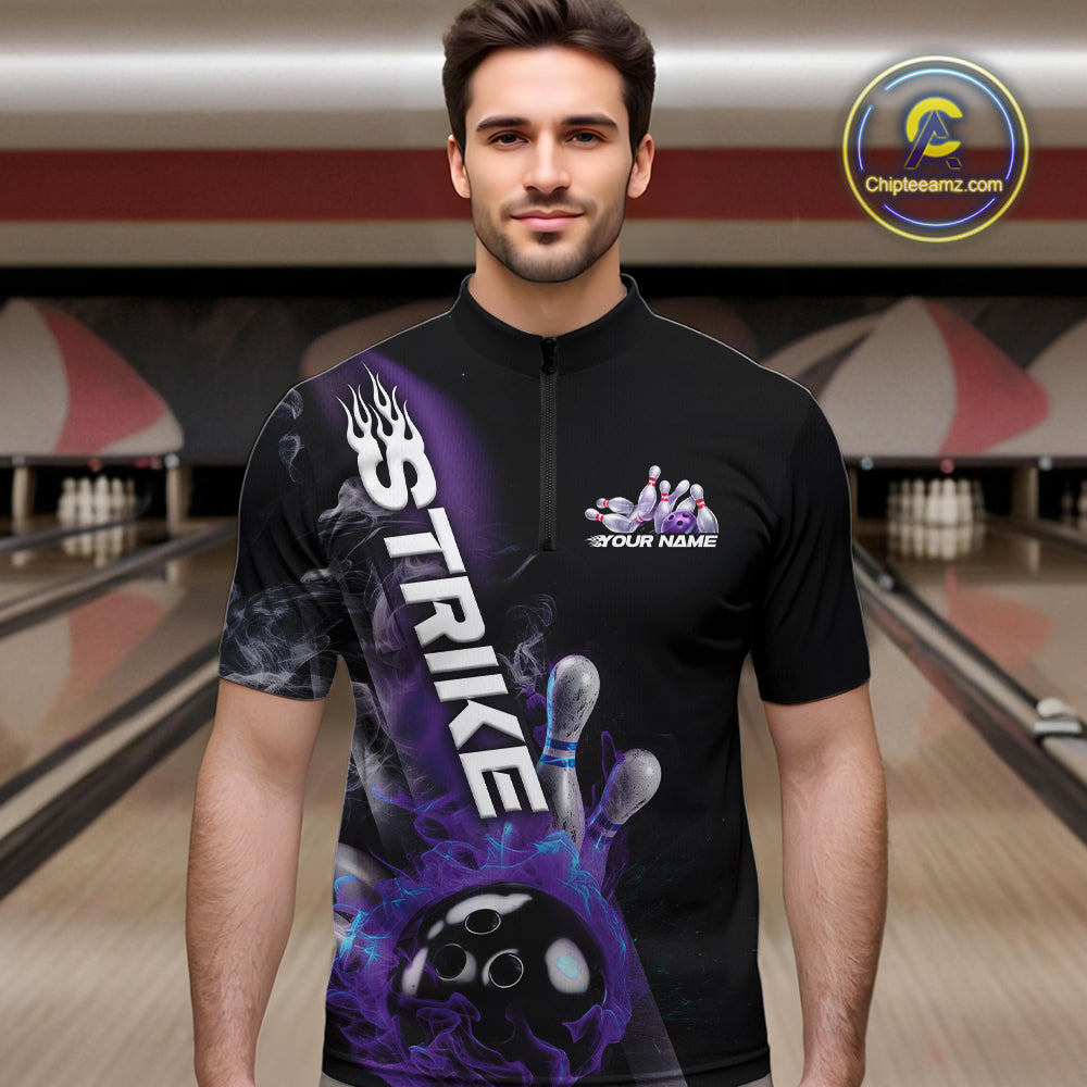 Custom Blue And Purple Flame Strike Bowling Team Quarter-Zip Shirts For Men, Fire Bowling Jerseys IPHW9572