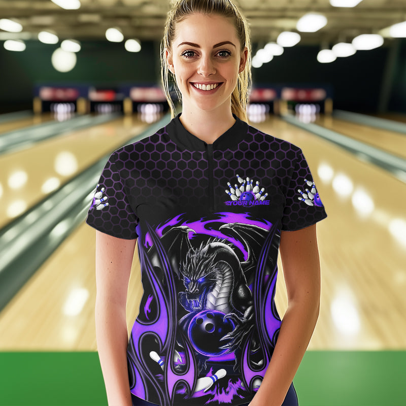 Custom Black And Purple Flame Dragon Bowling Women Quarter-Zip Shirts, Bowling League Shirt IPHW8840
