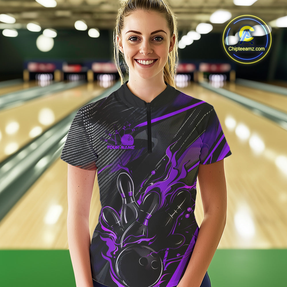 Custom Black And Purple Flame Bowling Team Women Quarter-Zip Shirts, Fire Bowling Jerseys IPHW9782