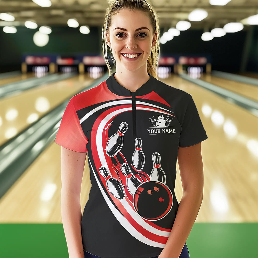 Black & Red Bowling Polo, 1/4 Zip Shirt For Women Custom Bowling Team League Jersey, Gift For Bowler NQS9490