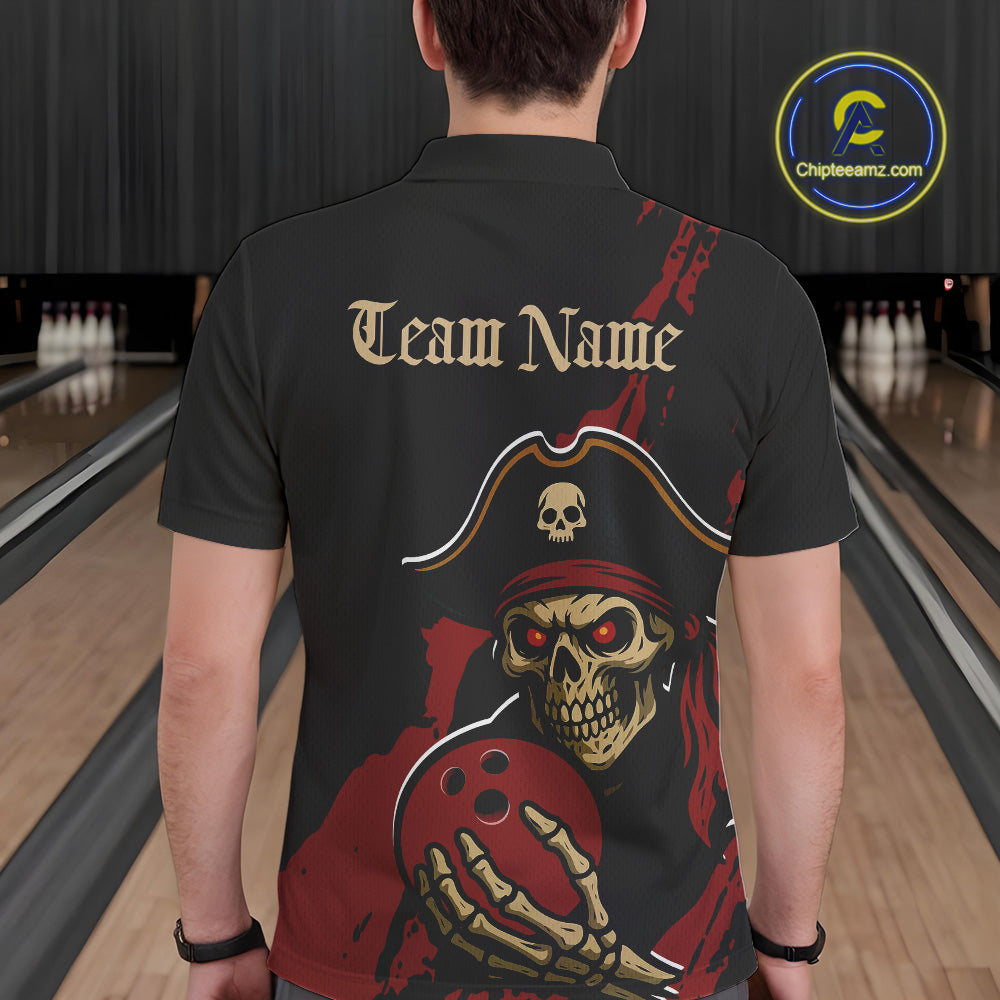 Custom Black And Red Pirate Bowling Men Polo Shirts, Bowling Team Bowling League Shirt IPHW9048
