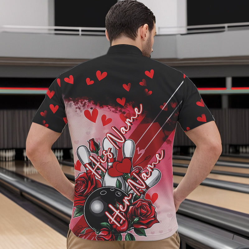 Custom Black And Red Heart Theme Valentine Bowling Quarter-Zip Shirt For Men, Couple Bowling Shirt IPHW8353