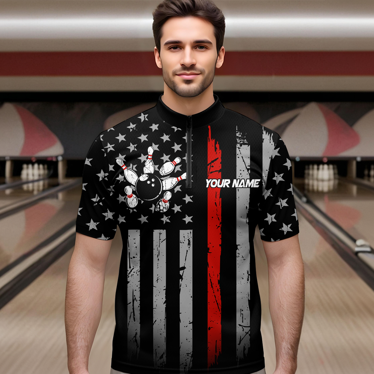 US Red Flag Bowling Shirt for Men Custom Name Polo & Quarter-Zip Bowling Jersey Bowling Team Shirt HNT23