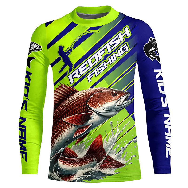 Personalized Redfish Fishing Tournament Jerseys, Long Sleeve Performance Shirts In Blue & Green IPHW6623