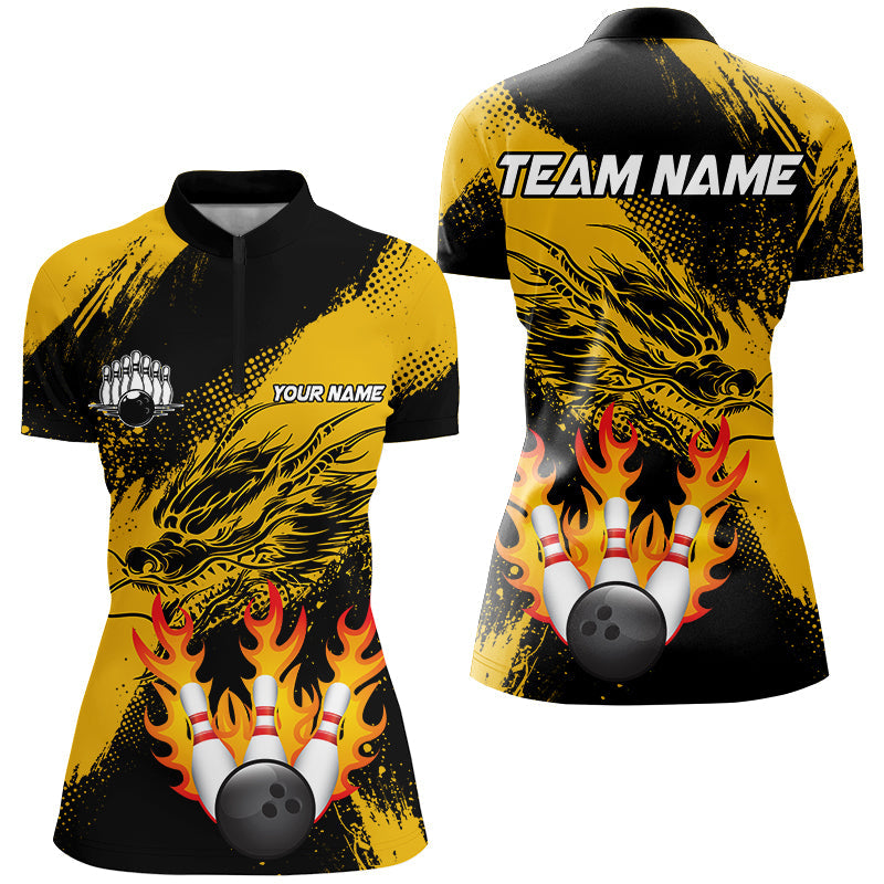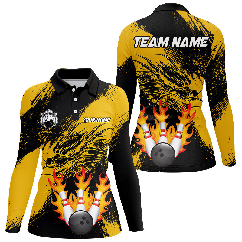 Black And Gold Custom Flame Dragon Bowling Shirts For Women, Dragon Retro Bowling Team Shirts NQS8505