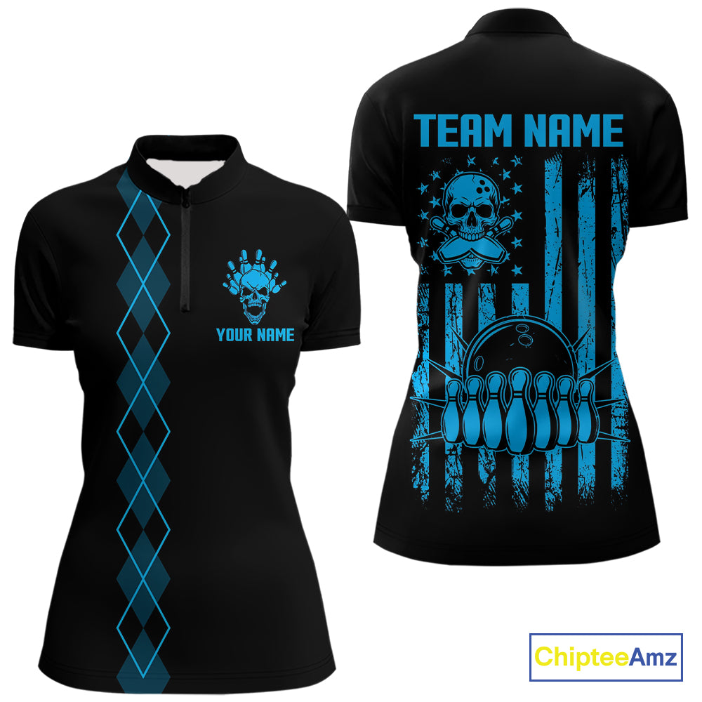 Custom Black and Blue argyle American Flag Skull retro Womens Bowling Shirts patriotic Team Jerseys NQS11132