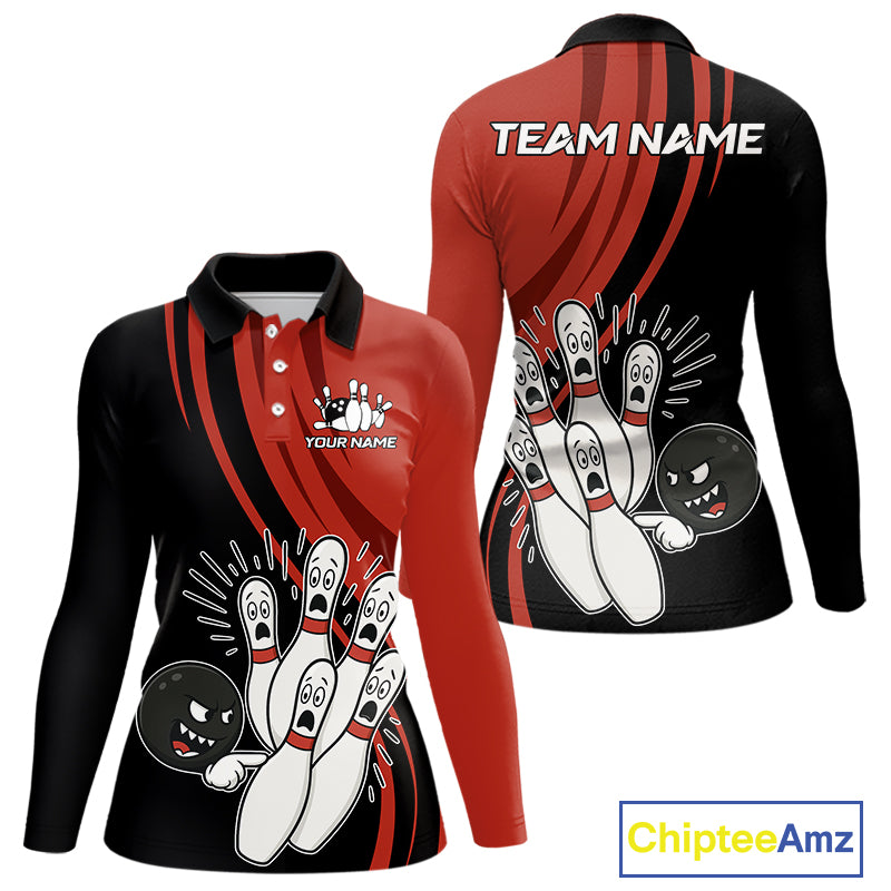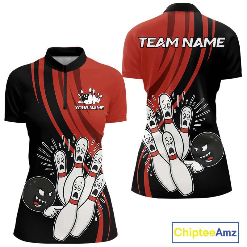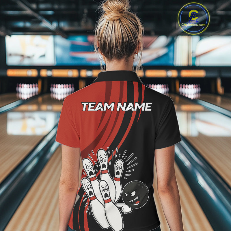 Funny Bowling ball and pins Black and Red Bowling Team Shirts For Women Custom Retro Bowling Jerseys NQS10225