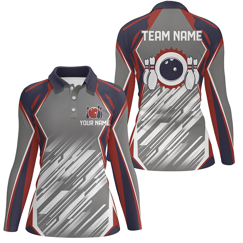 Grey abstract pattern Retro bowling ball and pins custom team Women Bowling Polo Shirts NQS7480