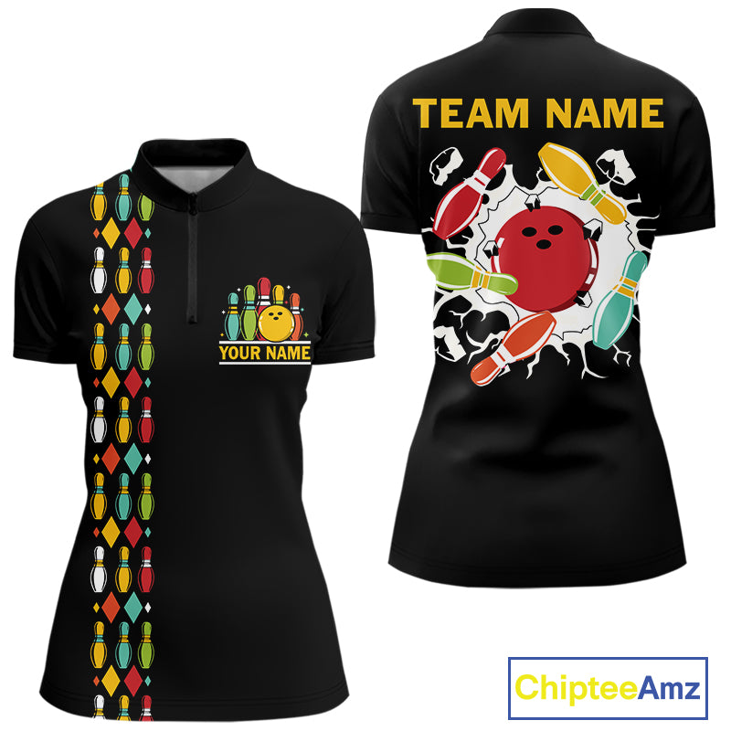 Personalized Black and Colorful Retro Bowling Polo, 1/4 Zip Team Shirt For Women Custom Bowling Gifts NQS11106