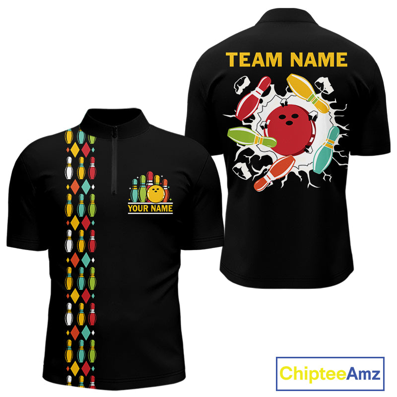 Personalized Black and Colorful Retro Bowling Polo, 1/4 Zip Team Shirts For Men Custom Bowling Gifts NQS11106