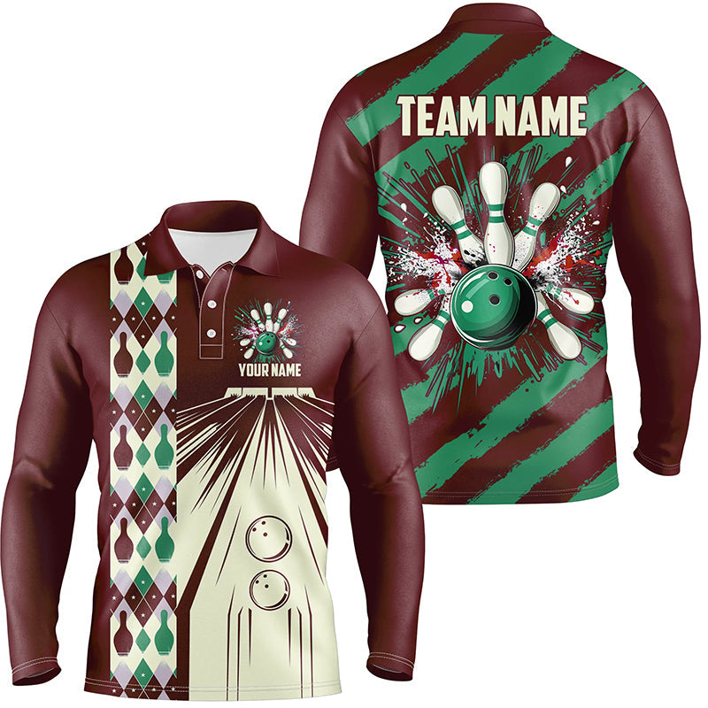 Personalized Red, White and Green Retro bowling Polo, Quarter Zip shirts for Men, Bowling Team Jerseys NQS8695