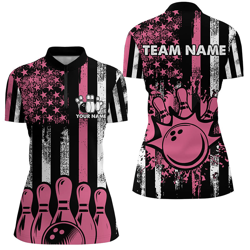 Pink American Flag Retro Bowling Polo, Quarter zip Shirt For Women custom breast cancer bowling jersey NQS8465