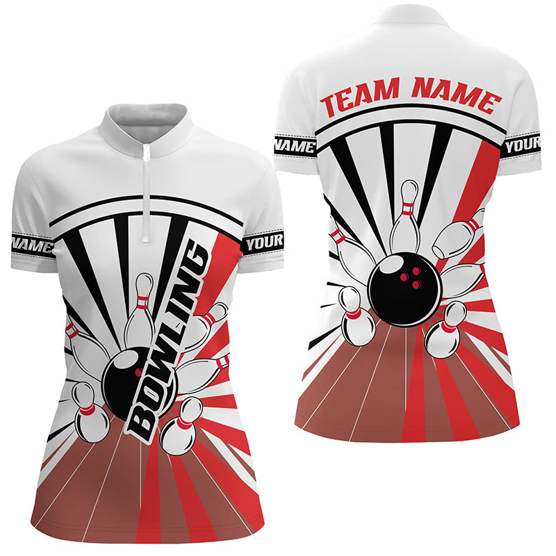 Retro Bowling ball and pins custom Women Bowling Polo, Quarter Zip Shirts, team bowling jerseys | Red NQS8194