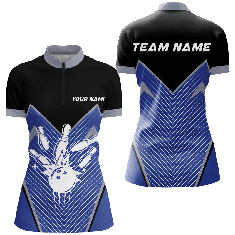Retro Bowling Polo, Quarter Zip shirts for Women custom Bowling Team League Jerseys | Blue NQS8553