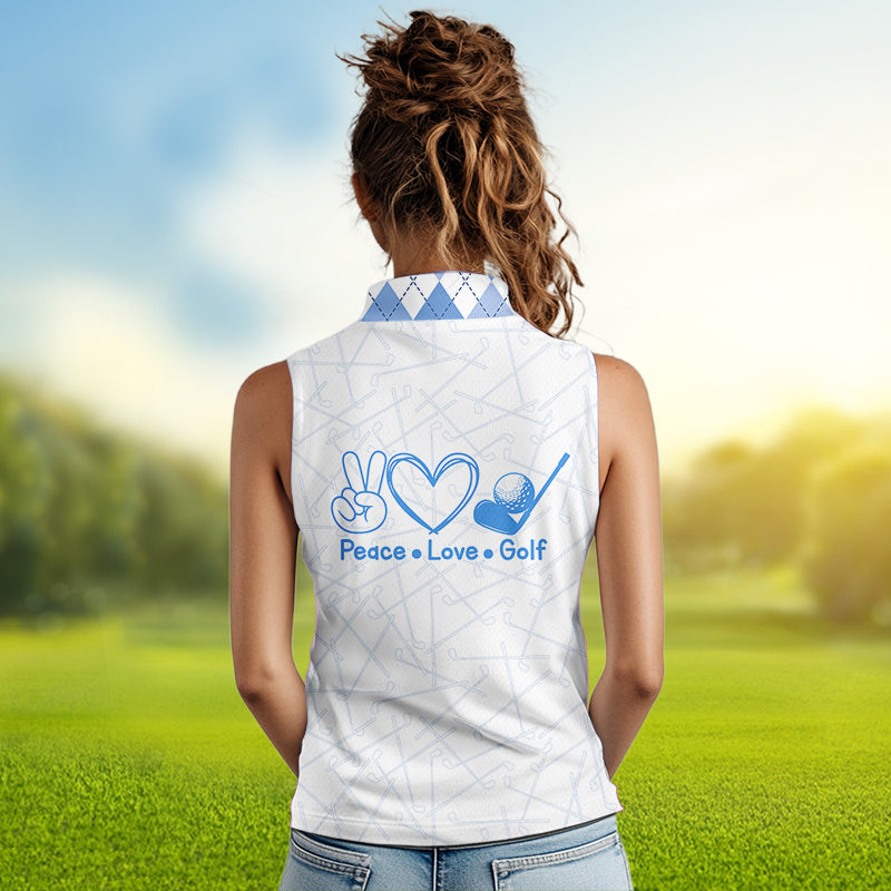 Blue argyle pattern Women Sleeveless polo shirt custom peace love golf jersey, ladies golf attire NQS9506