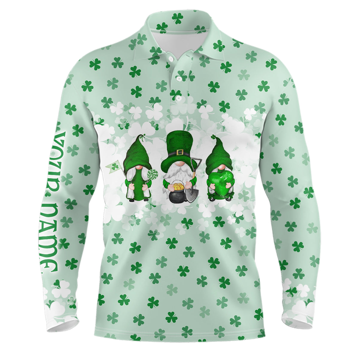 St. Patrick's Day Watercolor Gnomes On Green Clover Mens Golf Polo Shirts Funny Golf Shirts For Men LDT1020