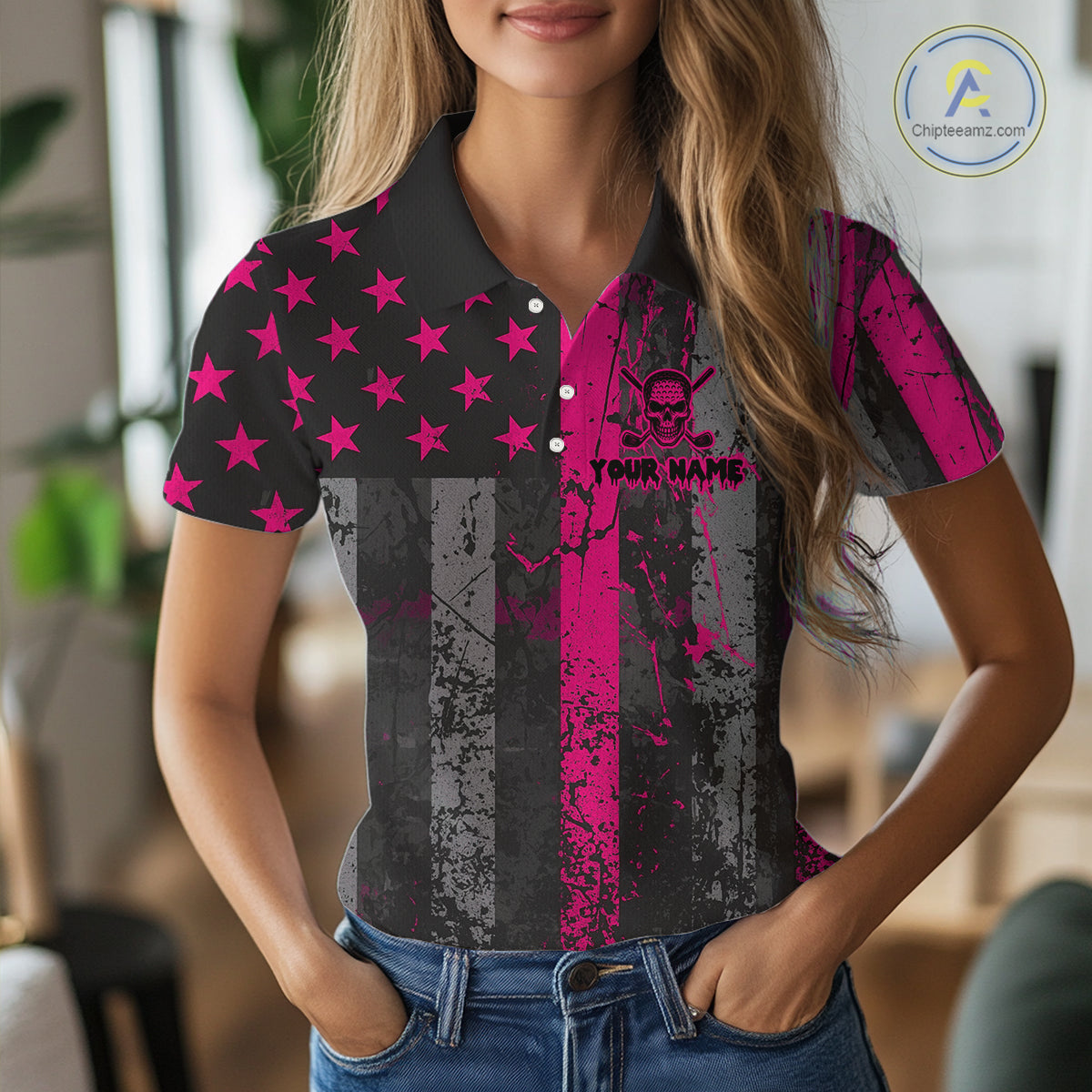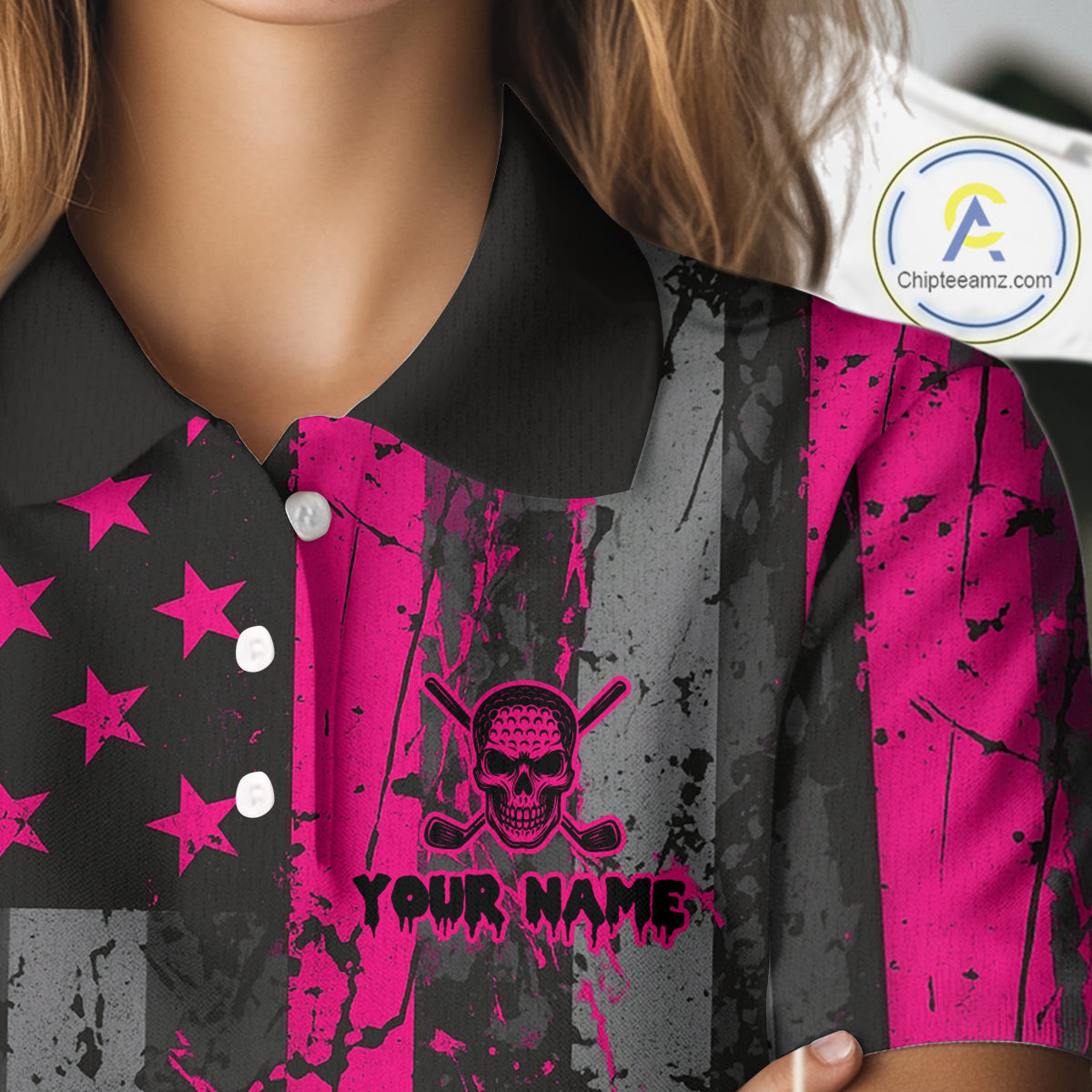 Custom Pink Grunge American Flag Patriotic Skull Golf Shirt For Women, Retro Ladies Golf top NQS10482