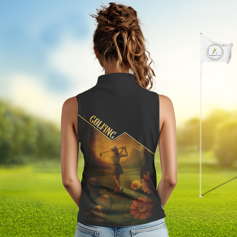 Black & Gold Golf sleeveless polo shirt for Women Custom Ladies golf tops, gift for golfers NQS10339