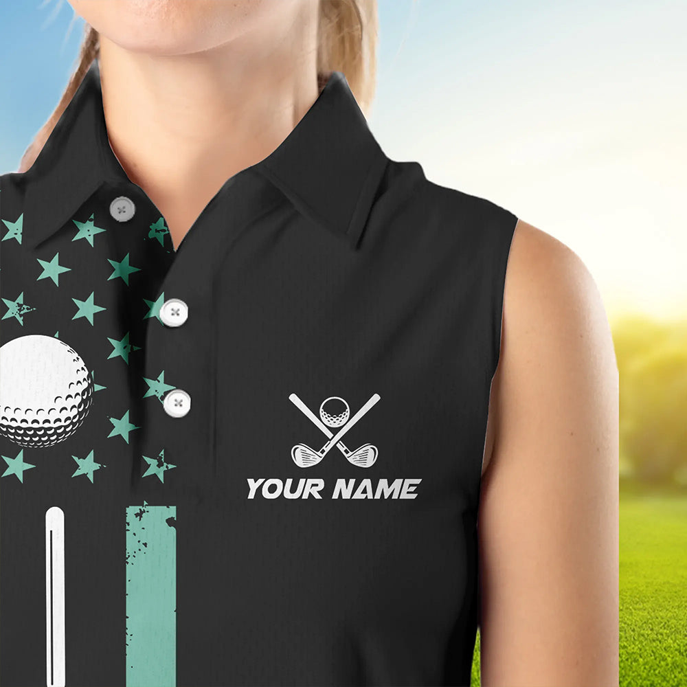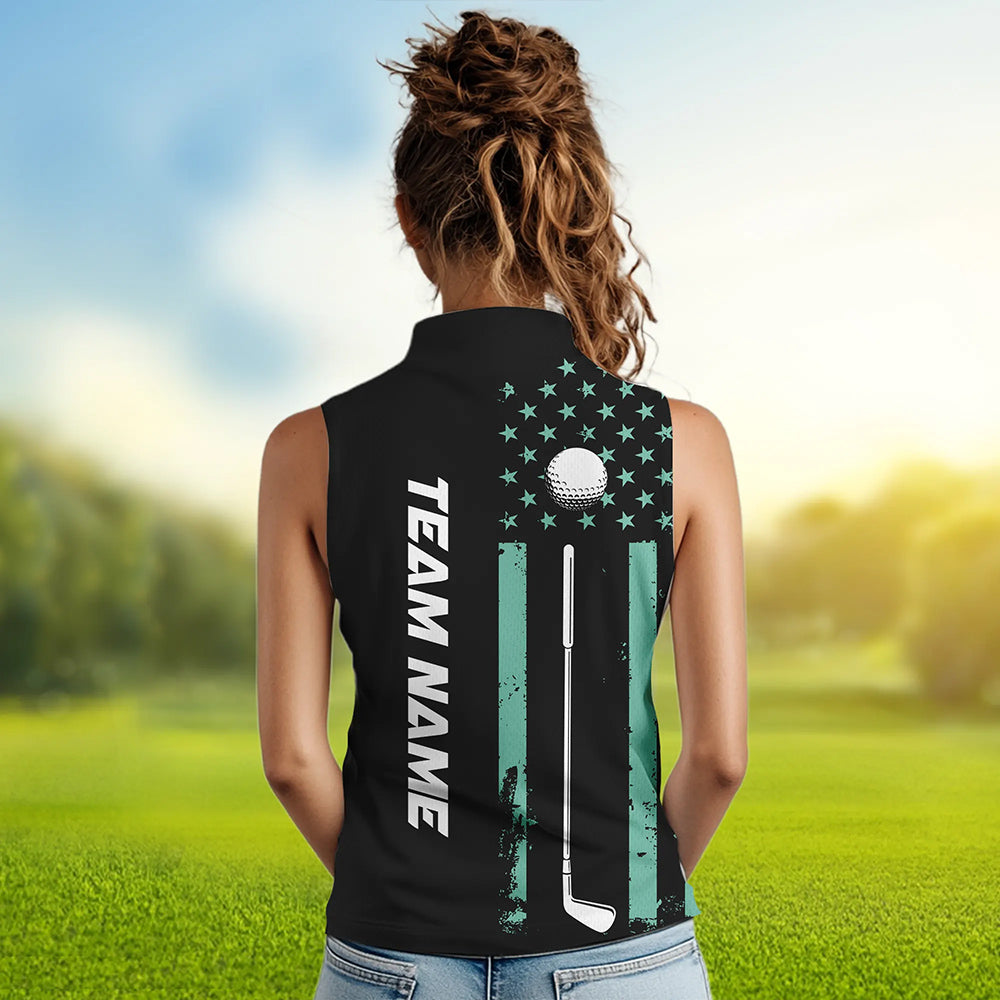 Black & Turquoise American Flag Women sleeveless polos custom patriotic golf attire for ladies NQS9355
